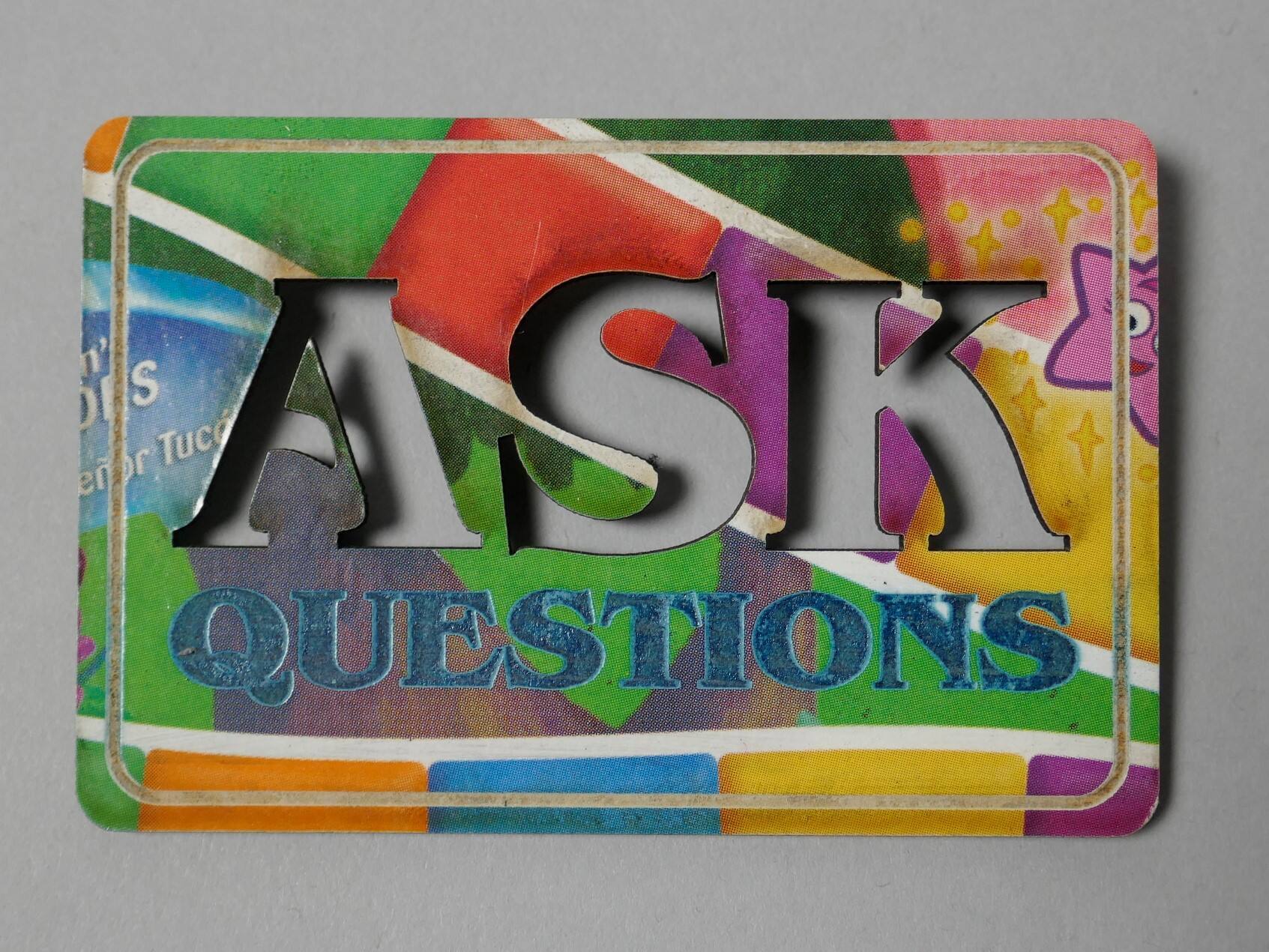 DescriptionA brightly colored pin in the shape of a rectangle with rounded edges. A laser-cut border surrounds the phrase "ASK QUESTIONS" also laser-cut and centered on the pin. ASK is completely cut out.ProvenanceMarjorie Schick (1941 2017), Pittsburg, KS;