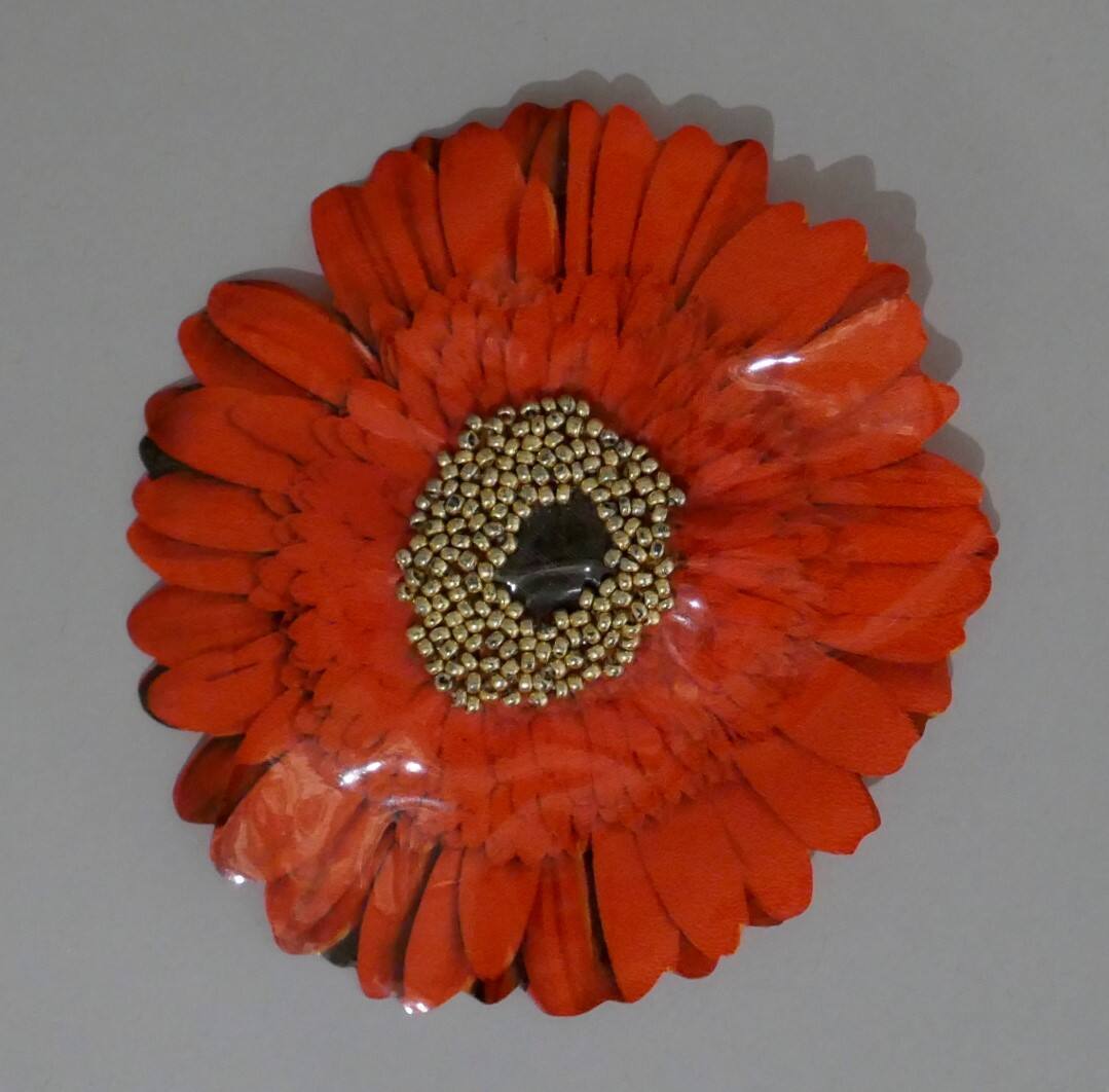 DescriptionA brooch created by a plastic vinyl cutout image of a red flower, mimicking the shape, with gold seed beads sewn at the flower center.ProvenanceMarjorie Schick (1941 2017), Pittsburg, KS;