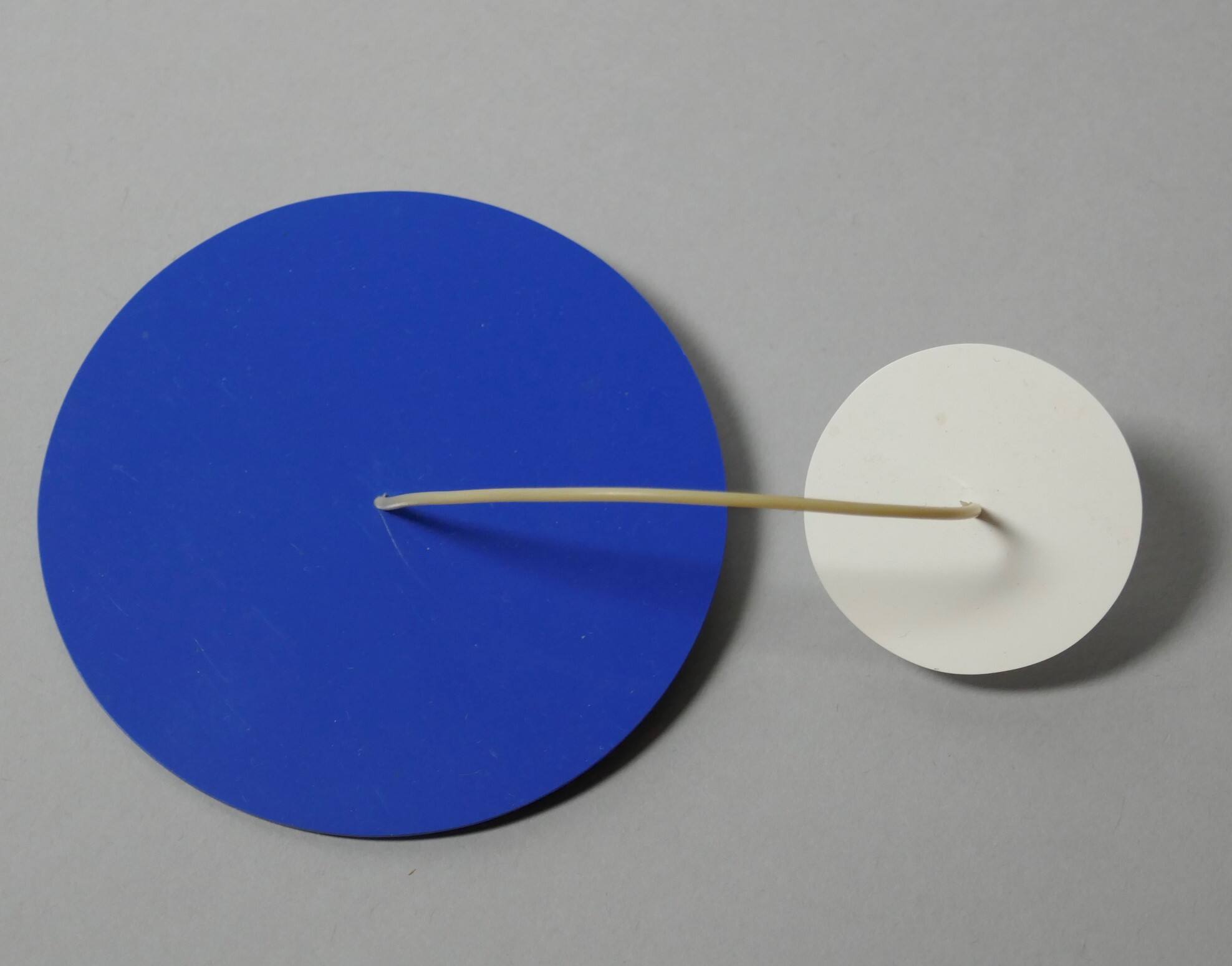 DescriptionA brooch with a large blue disc on the proper right and a smaller white disc on the proper left connected by a rounded white half circle wire bending out.ProvenanceMarjorie Schick (1941 2017), Pittsburg, KS;