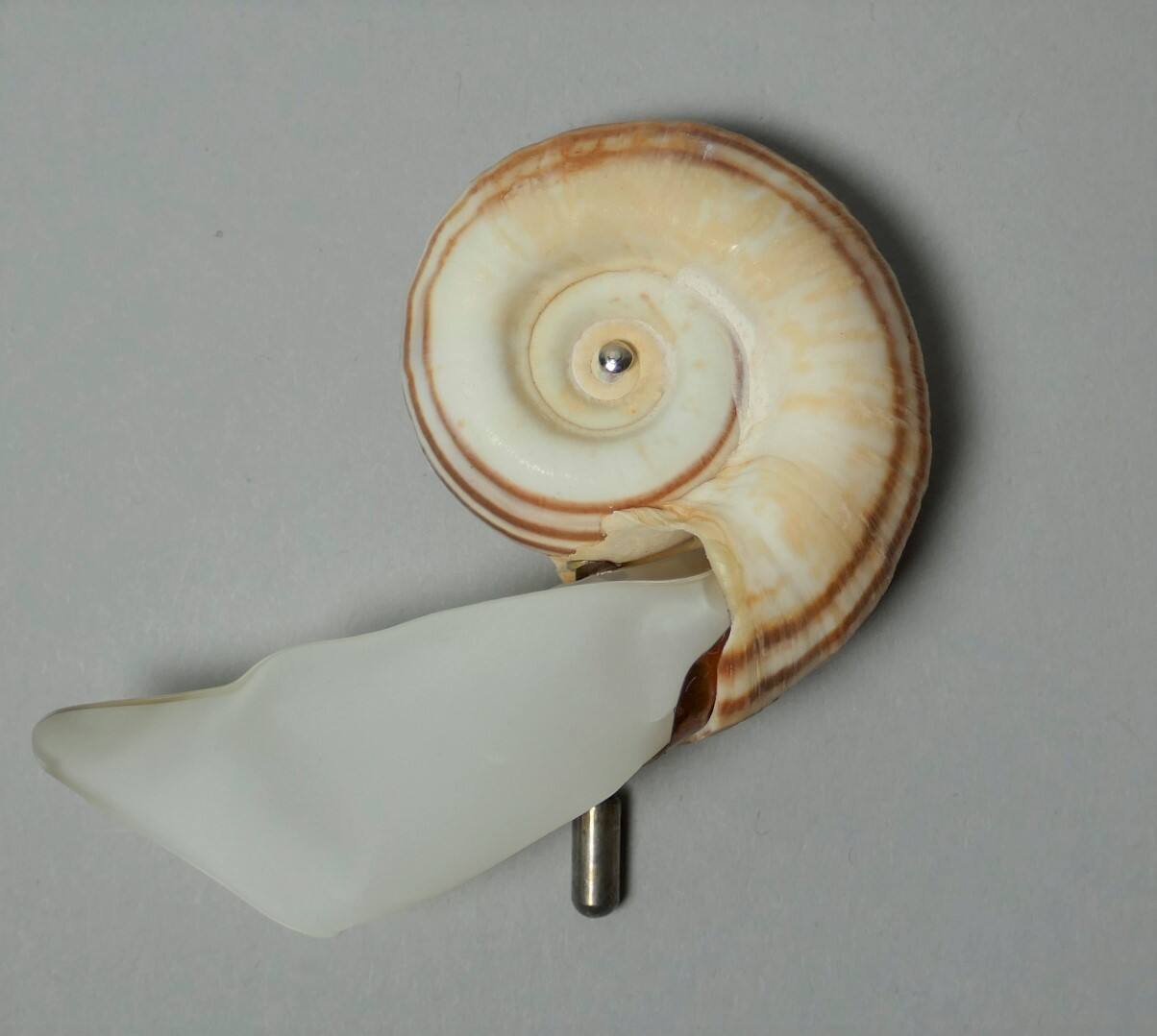 DescriptionA pin made from a circular seashell with a burned piece of Mylar spouting from the shell’s mouth.ProvenanceMarjorie Schick (1941 2017), Pittsburg, KS;