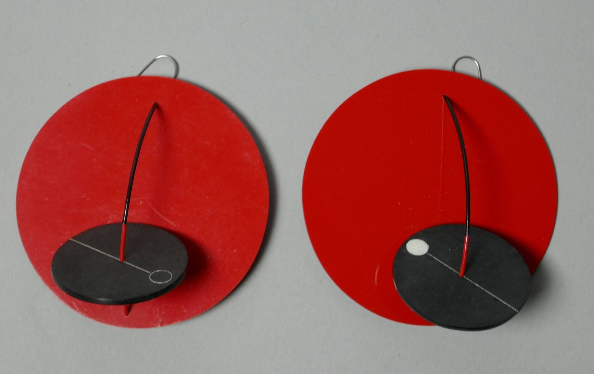 DescriptionA pair of earrings with a large red disc and a smaller black disc with white geometric designs connected by a rounded red and black half circle wire bending out.ProvenanceMarjorie Schick (1941 2017), Pittsburg, KS;
