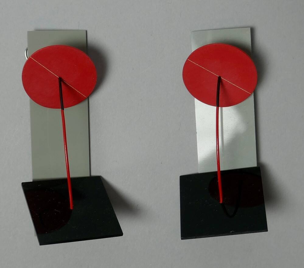 DescriptionA pair of earrings each composed of grey rectangle abutted with a black square connected by a rounded red and black half circle wire bending out. On the wire is a smaller red disc with white geometric designs.ProvenanceMarjorie Schick (1941 2017), Pittsburg, KS;
