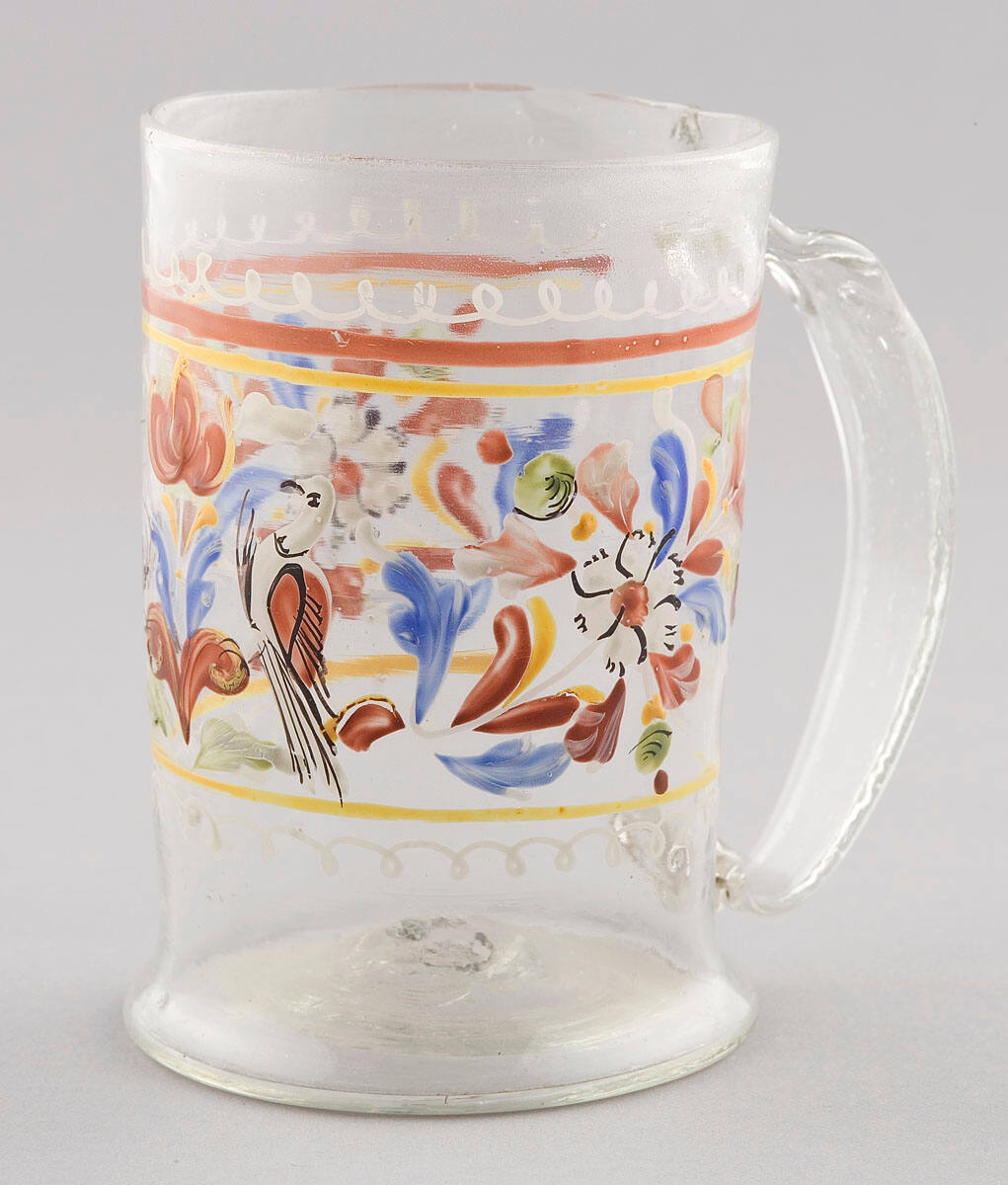 DescriptionUpper section of handle is constricted. Concave bottom with pontil mark, base spread to form foot, from which body curves sharply inward and flares slightly upward to rim. Curly white line, siena and yellow stripes above band of two floral sprays and pair of doves, center flanking stylized floral form. Curly white line and yellow stripe below.