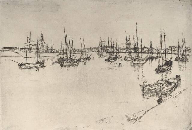 Gallery LabelAmerican expatriate James Abbott McNeill Whistler created San Giorgio as part of a set of 12 etchings of Venice commissioned by the Fine Art Society, a London-based organization seeking to elevate the status of prints by offering limited editions. The composition provides an expansive view of the Giudecca Canal, where boats rented by scores of tourists were moored. San Giorgio, the famous church and destination for sightseers designed by 16th-century architect Andrea Palladio, appears enticingly in the distance at the left side. By "biting" his plate in an acid bath and printing it on fibrous Japanese paper, Whistler enhanced his etched lines by making them appear especially brittle, an effect that suggests a hazy atmosphere.