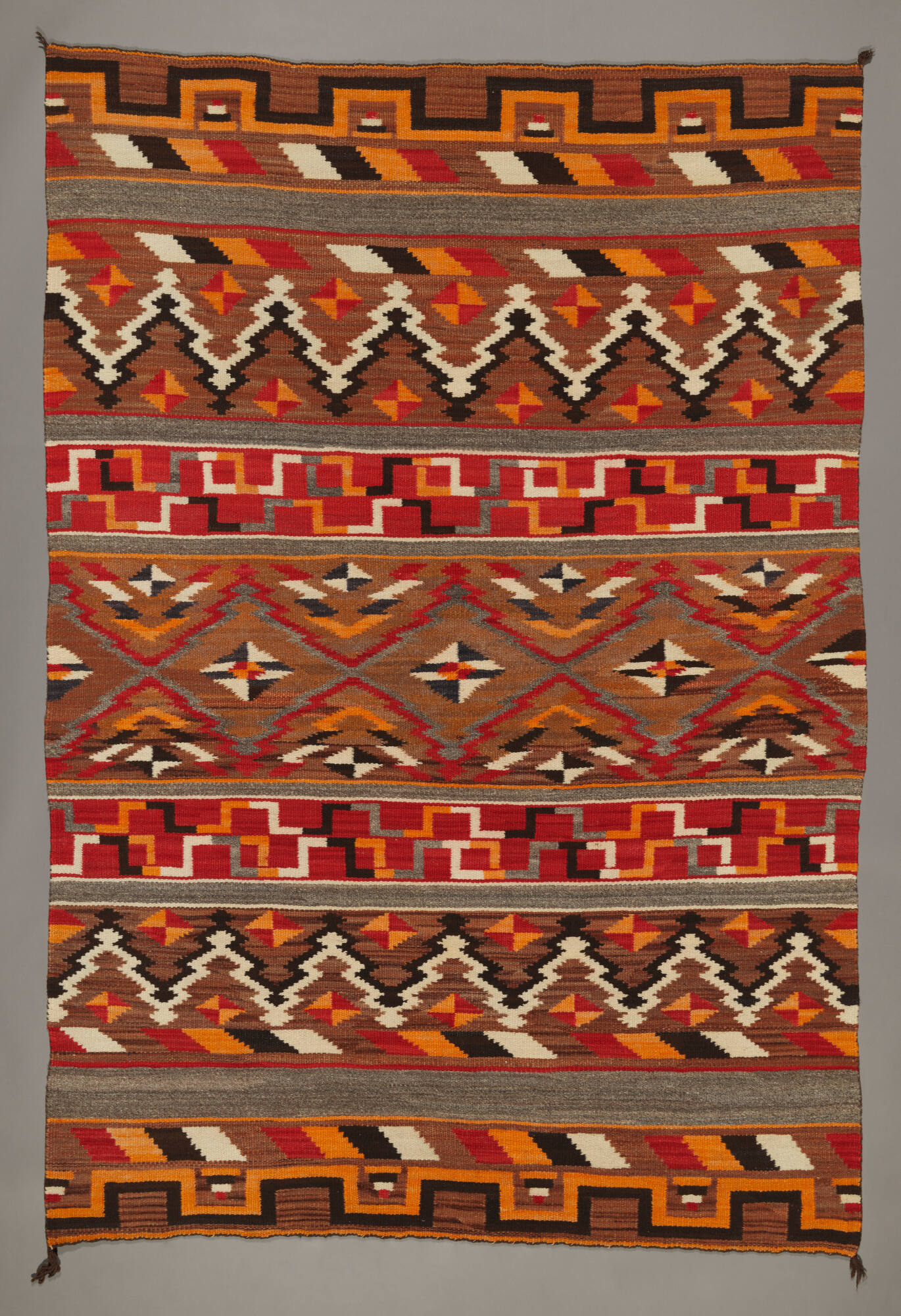 DescriptionWoven textile with horizontally banded configuration densely composed of diamonds, zig-zag lines, running bands of interlocking scrolls, diagonal blocks and open bands.ProvenanceMrs. Susan De Jong, Santa Fe, NM;