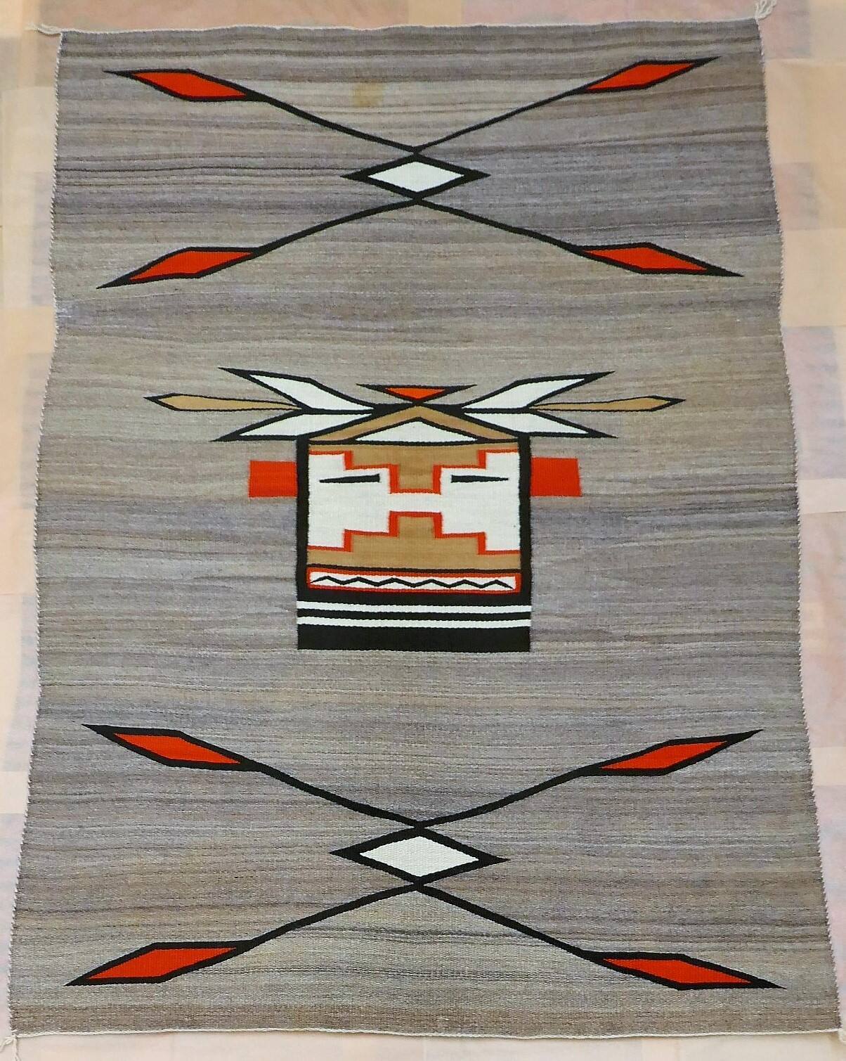 DescriptionWoven tapestry with a grey background with a central figure of a katsina mask and bold, geometric motifs at the top and bottom.ProvenanceMrs. Susan De Jong, Santa Fe, NM;