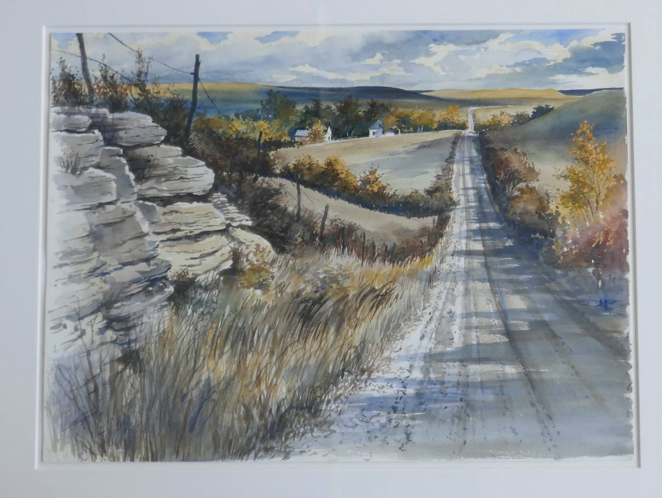 DescriptionThis horizontally oriented color watercolor depicts a dirt road extending into the distance through a rural, slightly hilly landscape. The road occupies the right half of the image along the bottom edge of the image and narrows as it goes back, eventually curving off to the right in the background. A short outcropping of whitish rock stands next to the road on its left side, behind long grasses. Two white buildings are visible in the center of the middle-to-far distance. Clouds fill a narrow blue sky above a high horizon line.Exhibition HistoryProvenance
