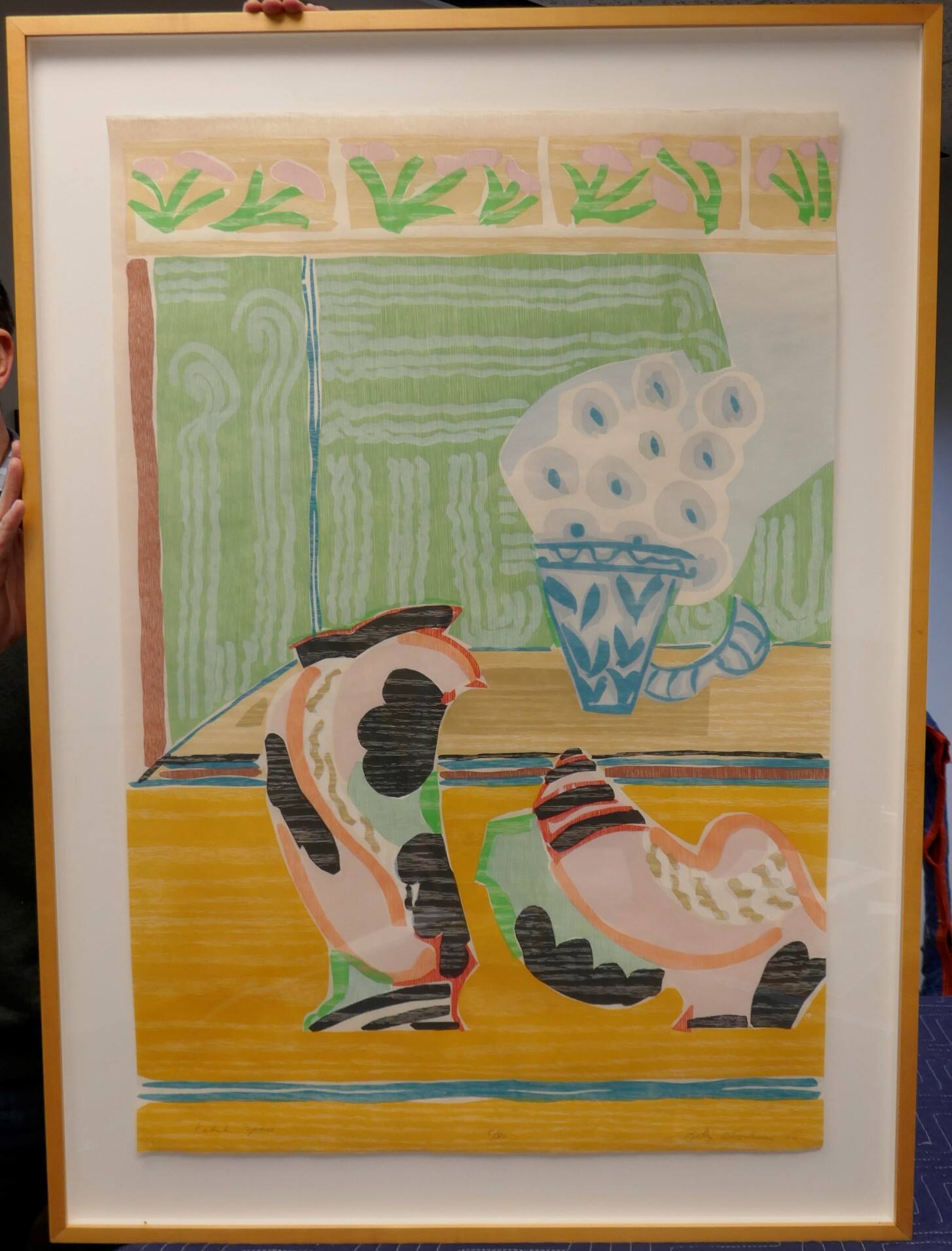 DescriptionThree multi-colored, patterned vessels or vessel fragments, two in the foreground and one further back, are staged on orange/tan surfaces in this vertically oriented color print. The perspective of the space is flattened. Blue patterns across a green ground decorate a back wall and a green, pink, and beige decorative border extends across the top of the print.Exhibition HistoryProvenance