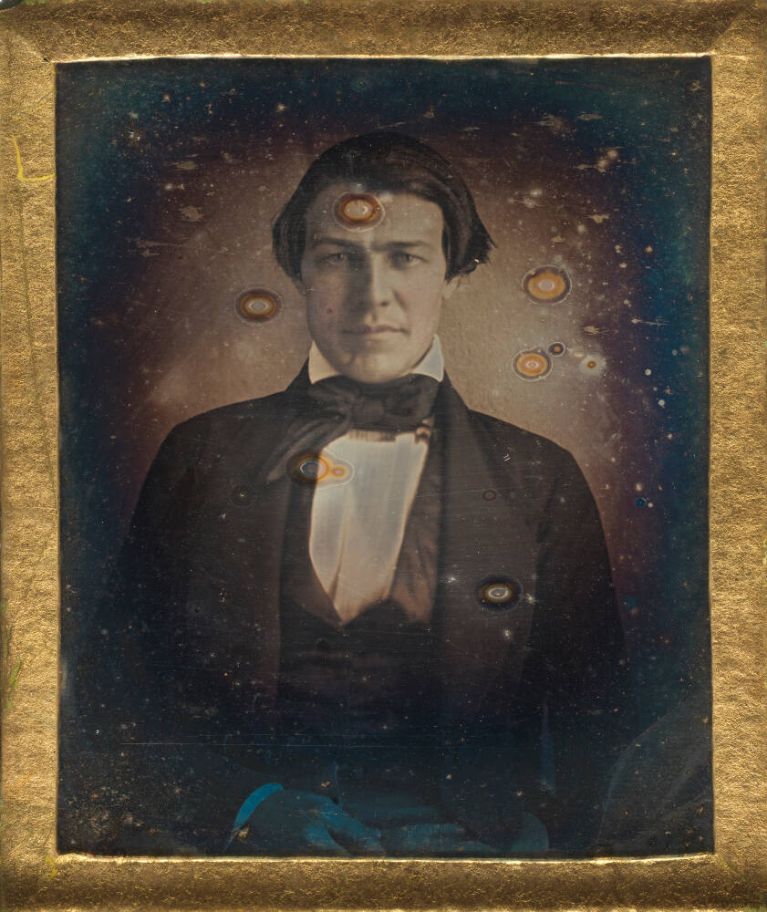 DescriptionImage of a seated man. His hair is parted on the side and covers the tops of his ears. He wears a jacket with a vest, stand-up collar, and bow tie. This sixth plate cased daguerreotype is housed in a gold-colored paper mat (no preserver) inside of a vertical-opening wooden case with a brown velvet liner (and detached lid).ProvenanceHall Family Foundation, Kansas City, MO, 2019;