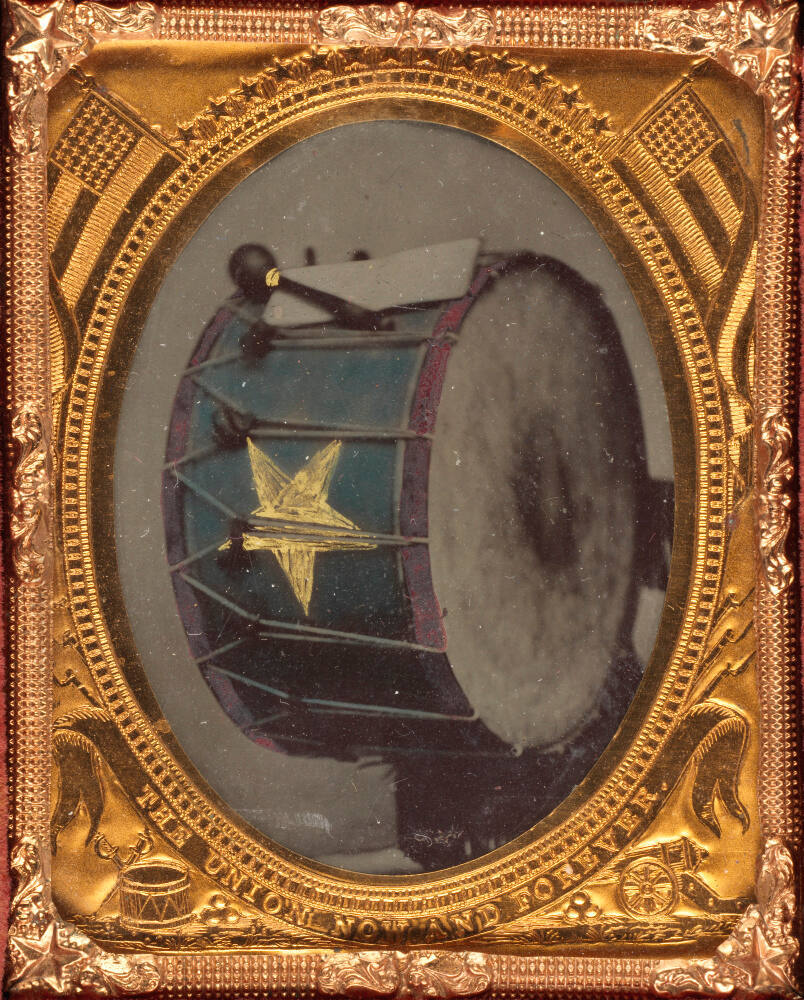 On paper liner in case behind plate, in black type: "A.P. CRITCHLOW & CO., / Manufacturers of / Daguerreotype Cases. / A.P.C. & CO. / Are the Original Inventors of the / Composition for the Union Case, / (so called,) including all the various shades / of color and fineness of texture pecu- / liar to their manufacture, and of the / Embracing Riveted Hinges, thus / securing them from breaking out / as do others that are inserted / with or without a / metal brace. / Hinge Patented / Oct. 14, 1856, & April 21, 1857.".