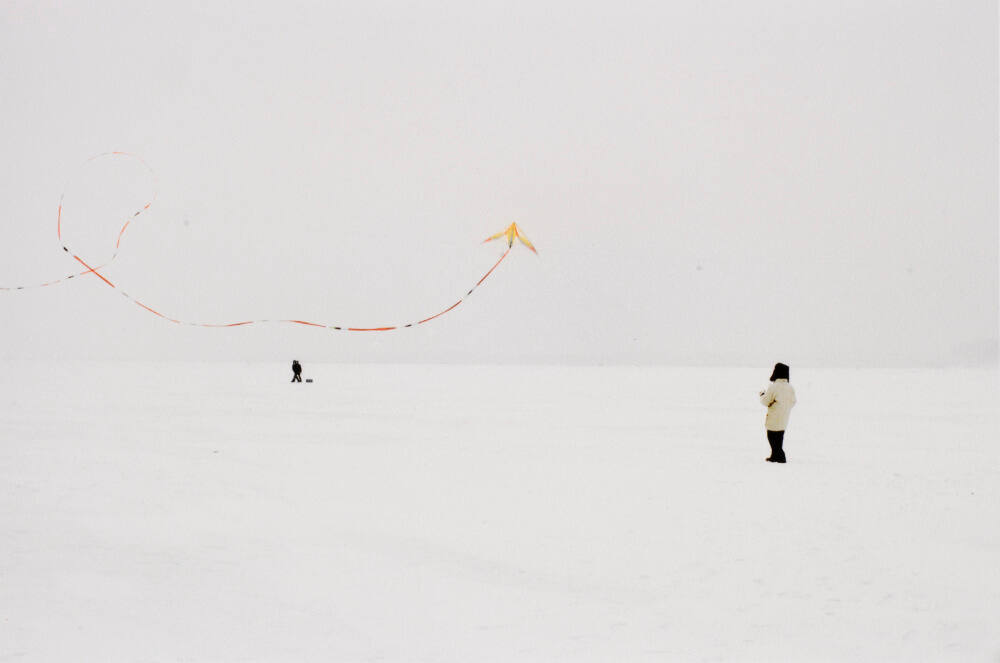DescriptionImage of a figure wearing dark pants and a hat with a tan coat. The figure stands in a pristine snowy landscape and faces a yellow kite with a long orange tail that floats in the white sky. The tip of the kite points towards the top center of the frame. Two figures are slightly visible in the distance central left.ProvenanceHall Family Foundation, Kansas City, MO, 2019;