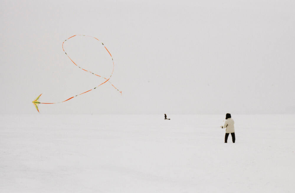 DescriptionImage of a figure wearing dark pants and a hat with a tan coat standing in a pristine snowy landscape while flying a yellow kite with a long orange tail. The tip of the kite points towards the left edge of the frame. In the distance (near the center of the image), a figure in profile walks while pulling something behind him.ProvenanceThe Hall Family Foundation, Kansas City, MO, 2019;