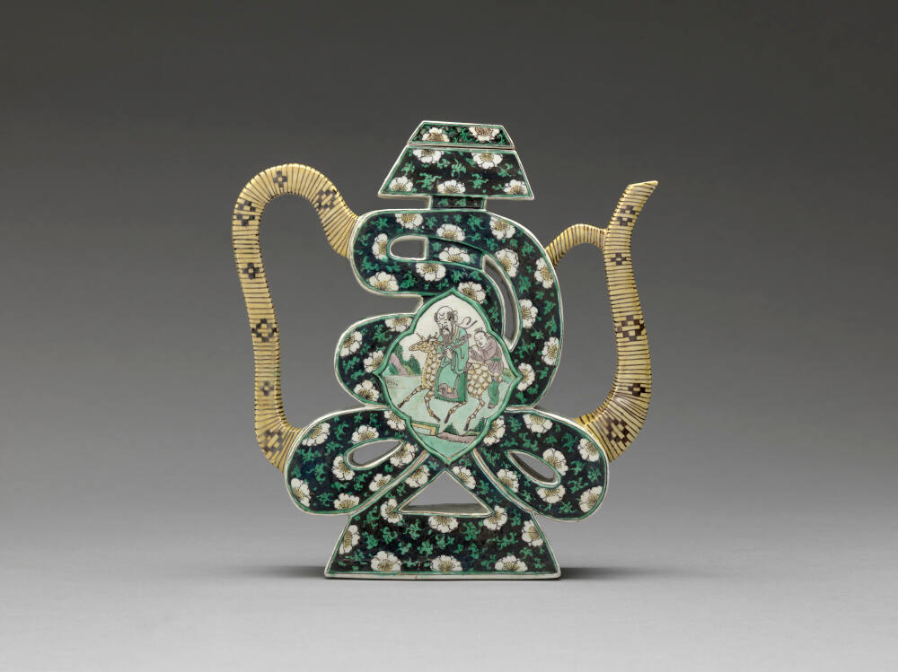 DescriptionFamille-noir character ewerGallery LabelThis distinctively shaped ewer was used for serving wine or water. The spout and handle imitate bamboo or reeds, and the body forms a Chinese character, shou 壽, longevity. The fresh palette of glazes against a black background is characteristic of a polychrome enamel technique developed with increased trade between Europe and China during the Kangxi Period.