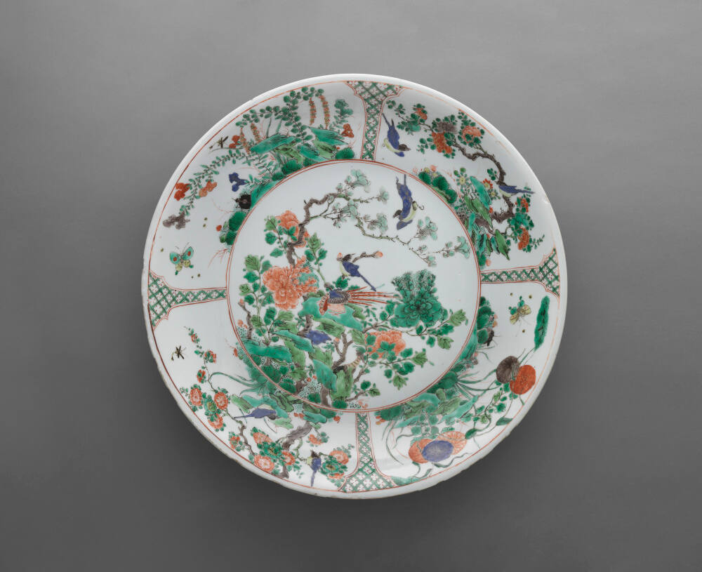 DescriptionA round plate with a wide border rim decorated in polychrome enamels. Four sections of floral motifs decorate the wide border. The plate center is decorated with more flower and includes peonies and a phesant. The color palette is predominantly translucent green but includes pink, yellow, and purple.