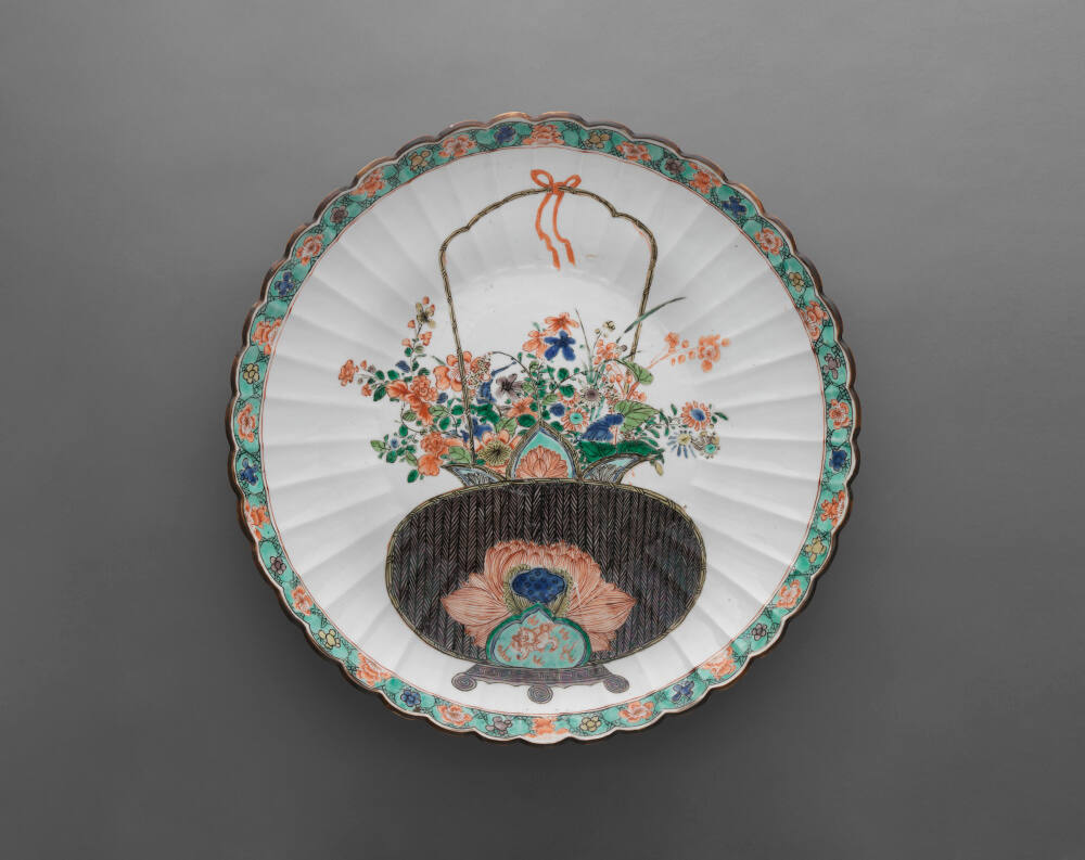 DescriptionA round plate with fluting extending to the rim decorated in polychrome enamels. A dense floral band decorated the rim of the plate. The plate center is decorated with a vase of flowers. The color palette is predominantly translucent green but includes pink, yellow, and purple.