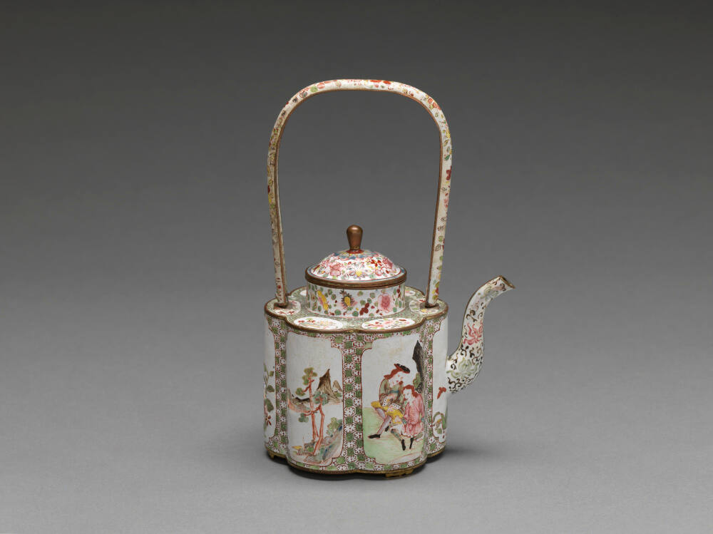 DescriptionThis is one of a pair of Canton enameled teapots. Each teapot is constructed with a copper body beaten into a lobed form with an upright mouth, S-curved spout, and upright handle. The body is in the form of an abstracted six-petal flower, with six rounded sides. The exterior is painted in brightly colored enamels decorated with Chinese and European figure medallions on a floral, insect and scrollwork ground.Gallery LabelThe colorful enamel paintings on this copper wine ewer visually mimic polychrome porcelain. During the late 1600s, Chinese craftspeople learned the technique of enamel on metal from European models. Though the painted figures wear 1700s European fashions, the landscapes are in the style of Chinese paintings. This type of vessel was made not only for the European export market but also for urban consumers in China.
