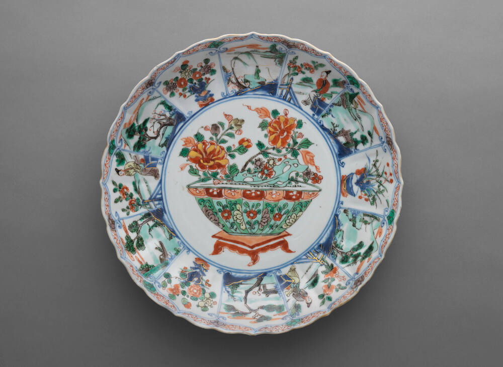 DescriptionA round plate with an everted and wavy rim decorated in polychrome enamels. The color palette is predominantly translucent green but includes pink, yellow, and purple. There are twelve petal-shaped panels alternately painted with antiques and figures in landscapes within a diaper border. In the center, a vase of flowers.