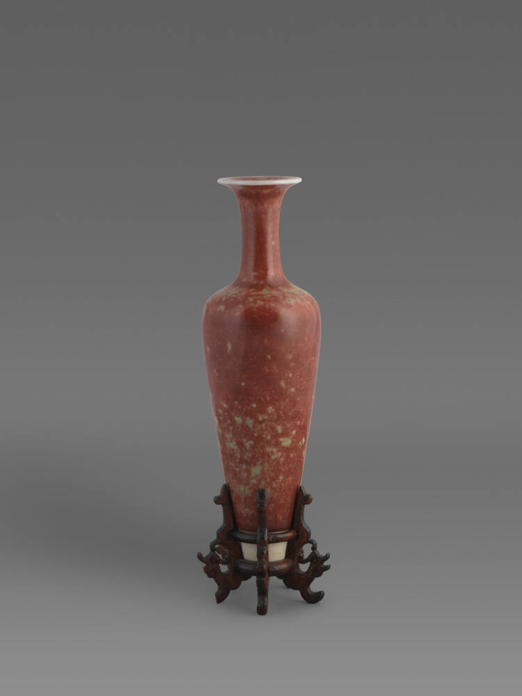 DescriptionThe small vase has a high shoulder similar to the form of amphora, called a “liuyeping (willow-leaf vase)”. The white porcelain is covered with copper oxide peach-bloom glaze mottled to copper green on one shoulder. The base has an unglazed high rim. Six-character imperial mark, Da-Qing-Kang-xi-nian-zhi, (made in the years of Kangxi period of the great Qing dynasty (1662 – 1722)), is inscribed on the bottom. The vase is incapable of standing securely on its own foot, so it is accompanied by a fitted wood stand, which may be later than the ceramic.Gallery Label
