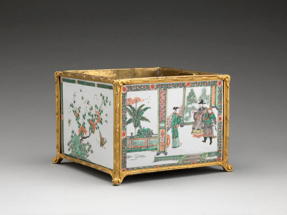 DescriptionA jardinière constructed from four porcelain table screen panels set in later ormolu mounts. Each panel is painted in a primarily transparent green palette with figural scenes of scholarly life or floral motifs.