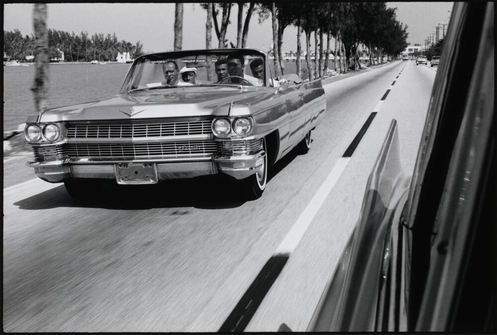 DescriptionImage of five men driving down road in a Cadillac convertible. A row of trees lines the right hand side of the road next to a body of water.ProvenanceAnonymous Donor,