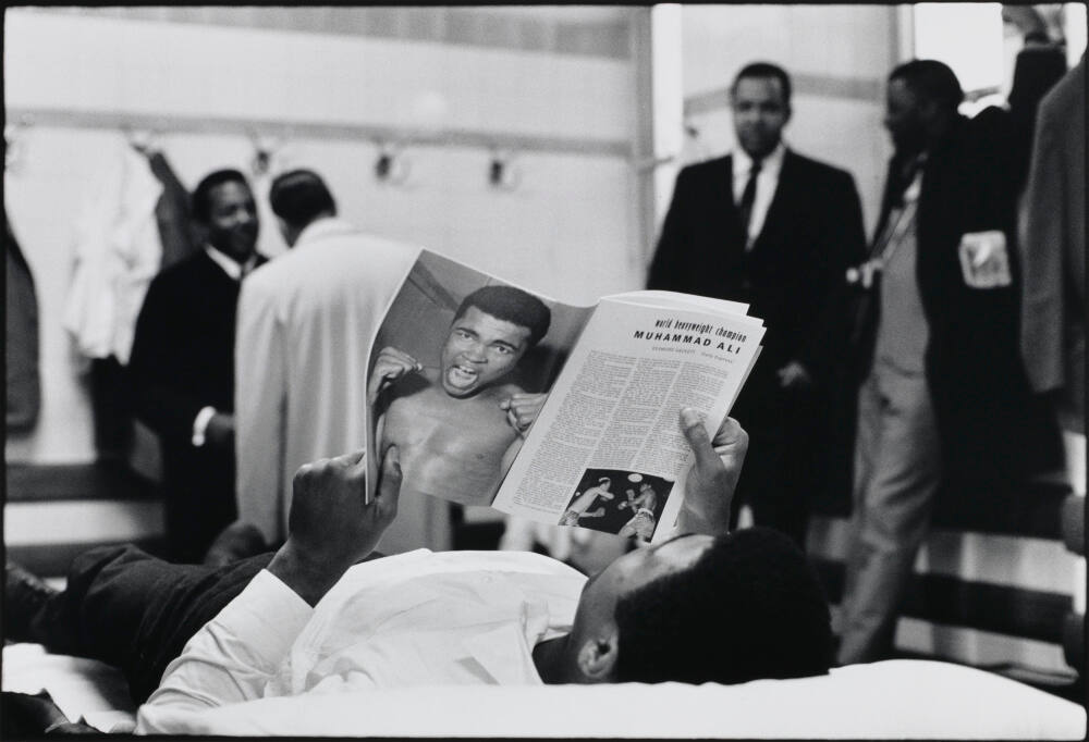 DescriptionImage of a man wearing pants and a button-up shirty lying on his back while reading a magazine article about Muhammad Ali; several men are in the background.ProvenanceAnonymous Donor,