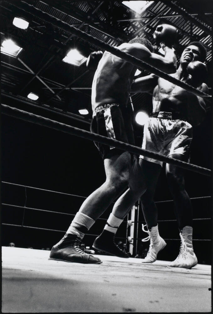 DescriptionImage of two men boxing in the ring. Image taken from a low perspective and bright lights shine down from open ceiling rafters.ProvenanceAnonymous Donor,