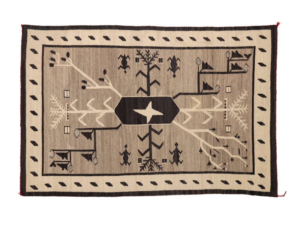 DescriptionA bordered rug with corn stalk pictorials; the body of the rug was woven without colored yarns.ProvenanceSusan De Jong, Santa Fe, NM;