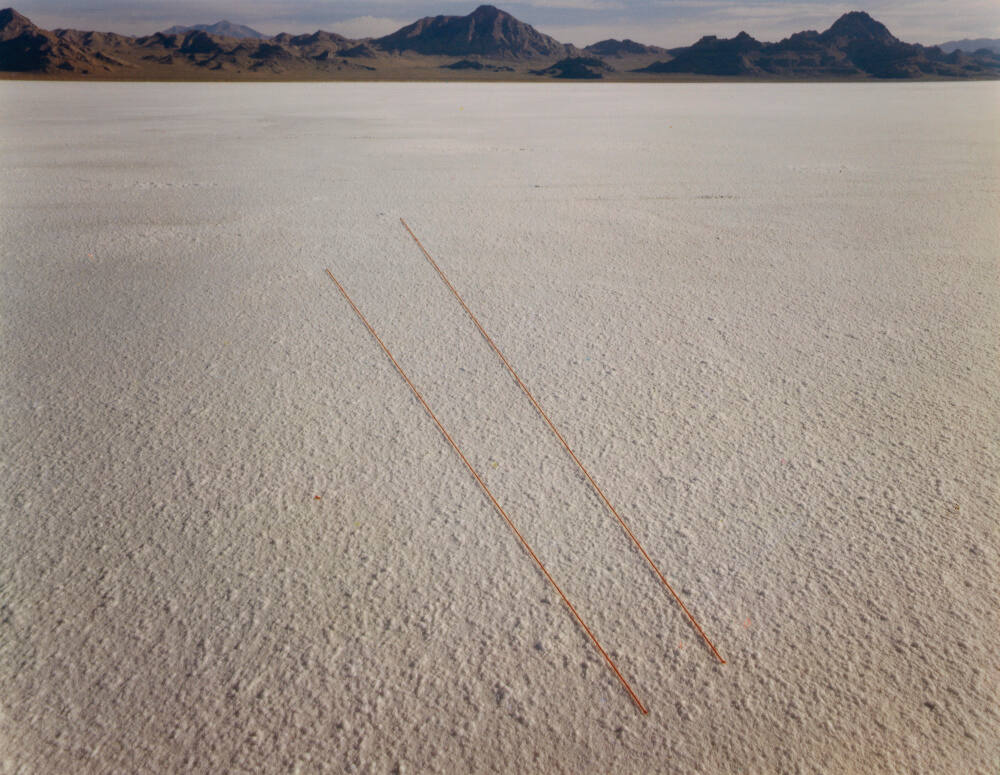 DescriptionImage of flat textured landscape with two parallel strings stretched taut and mounted onto the landscape at a slight angle. Mountains line the horizon in the background.ProvenanceThe Hall Family Foundation, Kansas City, MO, 2019;