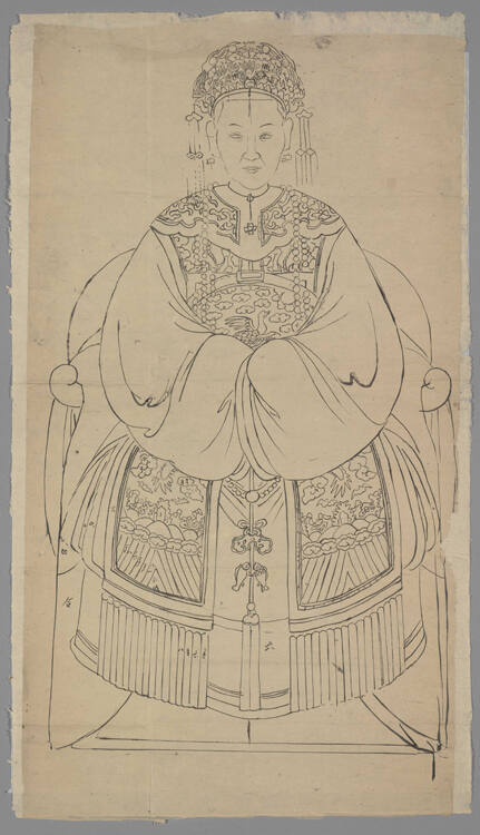 DescriptionFigure in elaborate robe and headdress seated on curved throne.