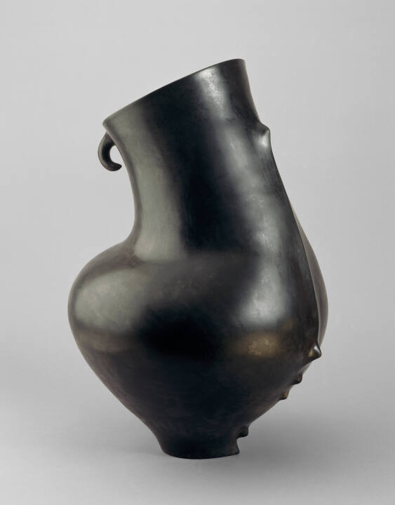 DescriptionLarge black asymmetrical vessel ressembling a human torso with angled neck ending in a curved hook-like form. The swelling lower body of the vessel forms a sharp vertical ridge with several small protuberances along the ridge.- L9
