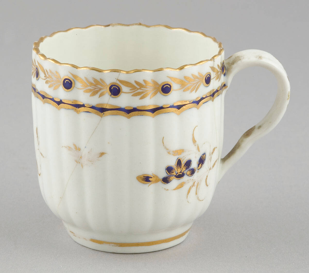 DescriptionDemitasse cup of white porcelain, with fluted sides, decorated with single flower and leaf designs in gold and blue, and continuous leaf pattern around top.ProvenanceMargaret Cameron Chapman (née Mann, 1865-1935), Kansas City, MO, by 1935;