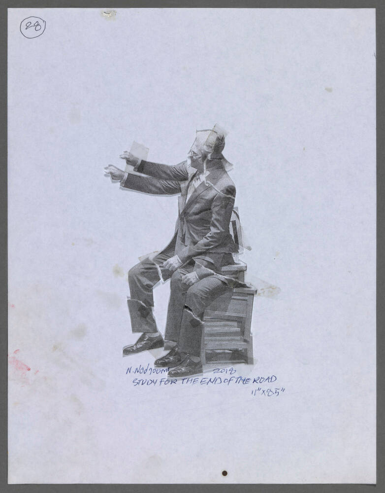 DescriptionA black and white print image of a white male figure in a suit and dress shoes, seated on an unknown object. The image has been duplicated, cut and torn, reassembled and taped in the middle of a white sheet of paper. The collaged figure is facing sideways, and has two right arms, two left arms, and three legs. The two right arms are outstretched and parallel to the ground. Below the figure’s feet contains the artist’s writing: “N. NODJOUMI 2018 STUDY FOR THE END OF THE ROAD 11”X8.5.”ProvenanceWith Taymour Grahne Art Limited, by 2018.