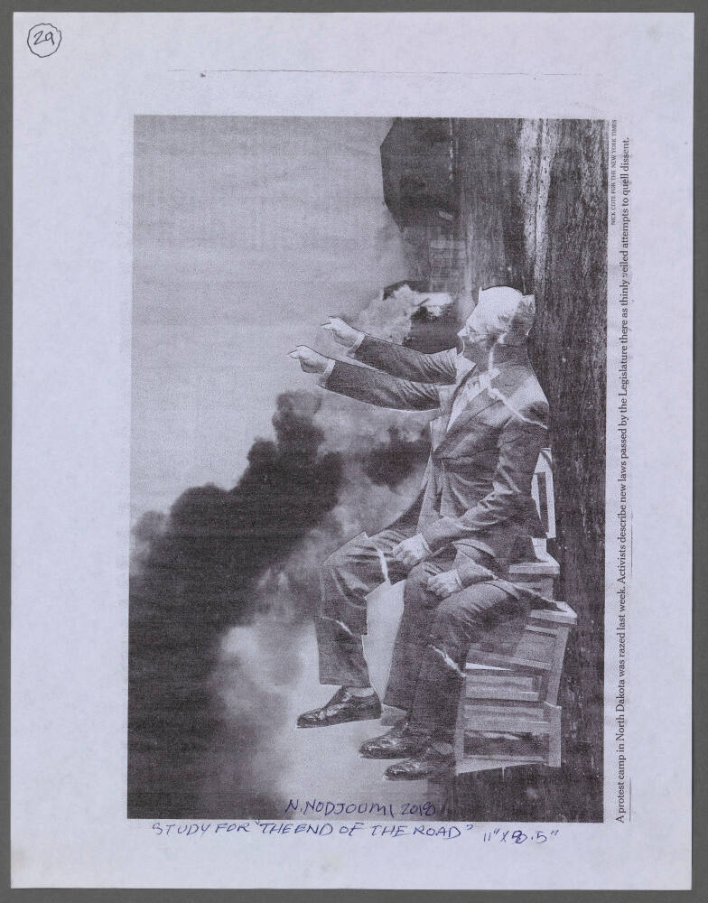 DescriptionA grayscale inkjet print shows a black and white print image of a white male figure in a suit and dress shoes, seated on an unknown object. The image has been duplicated, cut and torn, reassembled and taped in the middle of a white sheet of paper. The collaged figure is facing sideways, and has two right arms, two left arms, and three legs. The two right arms are outstretched and parallel to the ground. The figured has been collaged over a newspaper photograph image of a burning campsite, which has been shifted on its side vertically. A small building is at the top center of the image. Black smoke is billowing from the center of the image to the left hand corner. The bottom of the study contains the artist’s writing: “N. NODJOUMI 2018 STUDY FOR THE END OF THE ROAD 11”X8.5”. The right hand side of the image contains the newspaper caption “A protest camp in North Dakota was razed last week. Activists describe new laws passed by the Legislature there as thinly veiled attempts to quell dissent” and identifies the image as from the New York Times.ProvenanceWith Taymour Grahne Art Limited, by 2018.