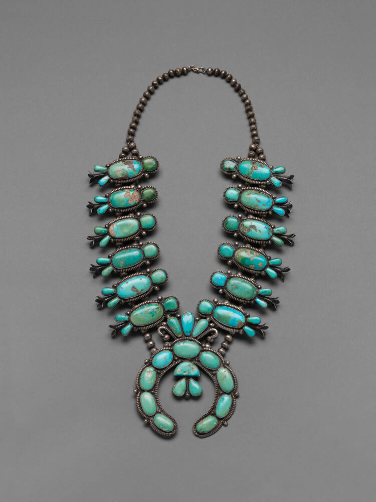 DescriptionLarge-size silver and turquoise necklace with six "squash blossoms" on either side of the central crescent (naja) pendant.ProvenancePurchased from Bruce Hartman, Prairie Village, KS by The Nelson-Atkins Museum of Art, Kansas City, MO, 2019.