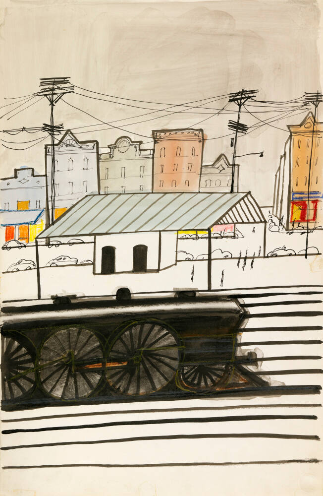 Steinberg traveled widely and frequently rode trains across the United States and abraod. These experiences seeped into his musings as well as his art, with trains frequently appearing in drawings. "Traveling by train," Steinberg noted, allows us to "...see most of all the back sides of cities. The view is 'lateral'..." In this drawing, the view Steinberg shares with us is lateral, too, as if we are rolling past the train and the landscape beyond on a parallel track.