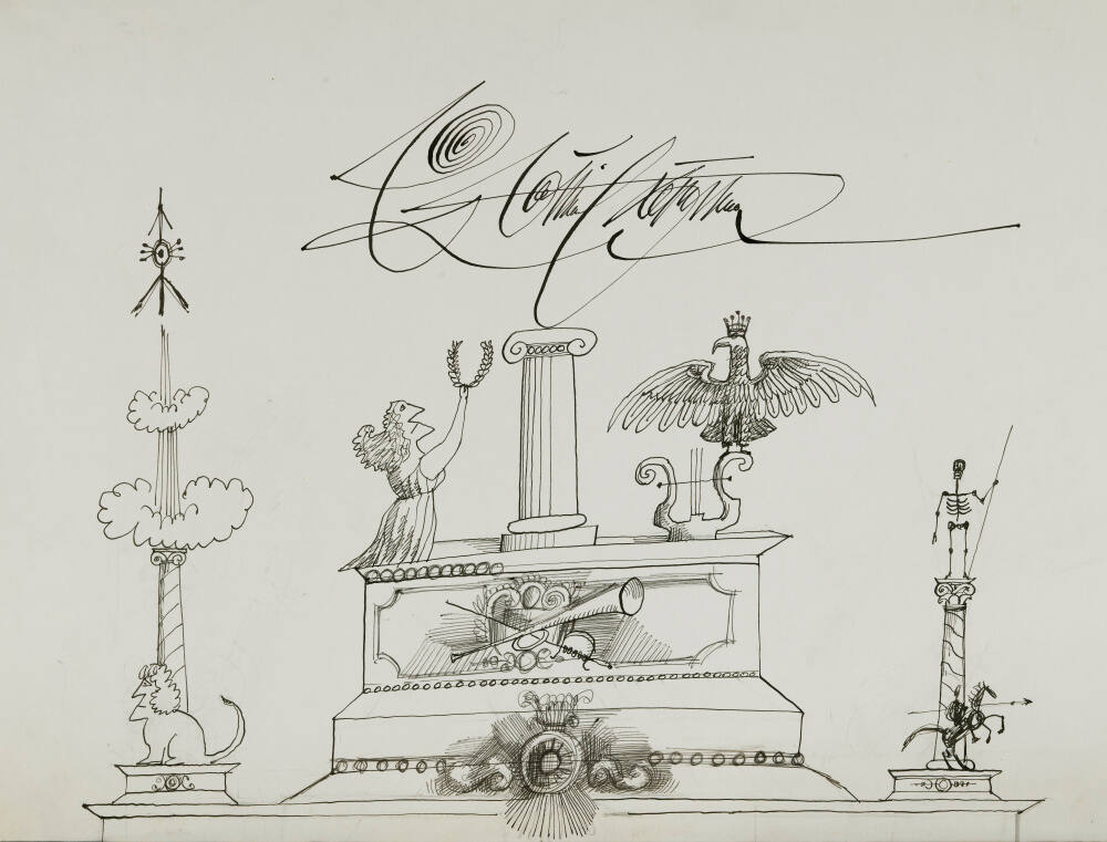 Described by the writer Roger Angell as a "world-class noticer" for his ability to translate observations into drawings, Steinberg was also the architect of imaginary worlds. This monument takes several cues from real ones such as the decorative base, classical column, laurel wreath, and crown-wearing eagle. The hovering inscription seems like a clue, yet it offers us no further context in determining to whom or what Steinberg pays tribute. The inscription, like this monument, is an invention of Steinberg's imagination - a flourish that evades deciphering.