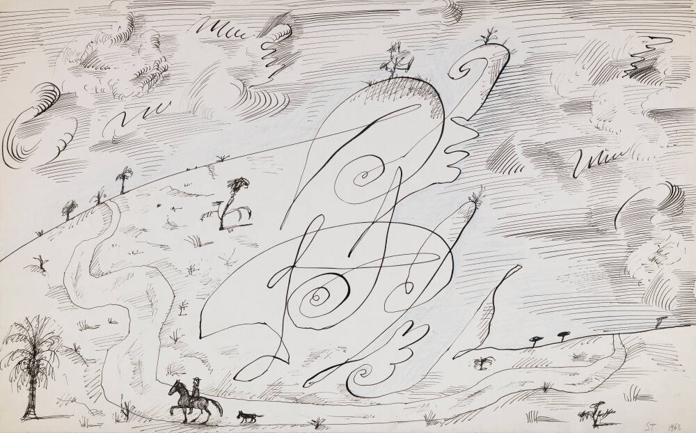 This drawing, with its chaotic horizon line that tangles with the unintelligible script at its center, sparks many questions: Where are the horse, rider, and dog traveling along this winding path? From where have they come? These musings would have delighte Steinberg. He regarded viewers of his art as collaborators in the act of meaning making. He confessed a hope to make peope "jittery" with "situations that are out of context and contain several interpretations."