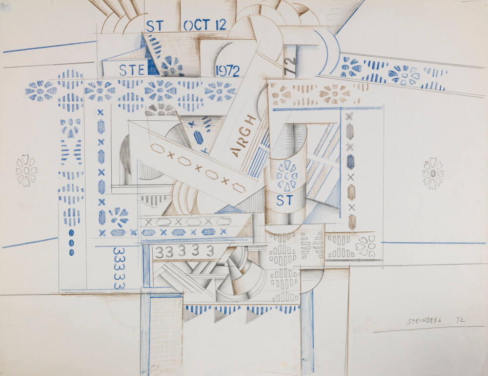 Just what happened to Saul Steinberg on October 12, 1972, the date called out in stenciled letters at the top of this drawing? Judging from the word “ARGH” at the center of the sheet, it could not have been good. is one-word visual diary entry is quite the contrast to his meticulous practice of keeping a record of his daily life in appointment books, including gallery openings, poker nights, romantic rendezvous, and commission deadlines.