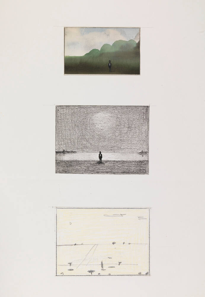 “When I do a landscape,” Steinberg asserted, “I use it in my own way. I don’t think of it as being a true landscape, a part of nature. It’s more like a collage of nature.” While simultaneously collecting actual postcards of places he visited, Steinberg made many of these Postcard-Style Landscapes in the 1970s and 1980s. Here, he collaged three sparsely detailed landscapes, created with different materials, onto a single sheet. In each, the foreground is occupied by a solitary figure—a stand-in for the artist taking in the world.