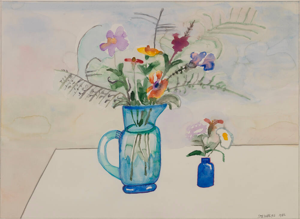 The still life was a subject Steinberg repeatedly turned to during his career. Compared to his playful treatment of other timeless themes, like portraiture, Steinberg approached this still life in a rather straightforward, traditional manner. This composition feels like a cousin to many of the floral still lifes that hang throughout the museum. It is, however, decidedly Steinbergian in a significant way: the pitcher and vase were his own. As such, this watercolor blurs the lines between still life and autobiography.