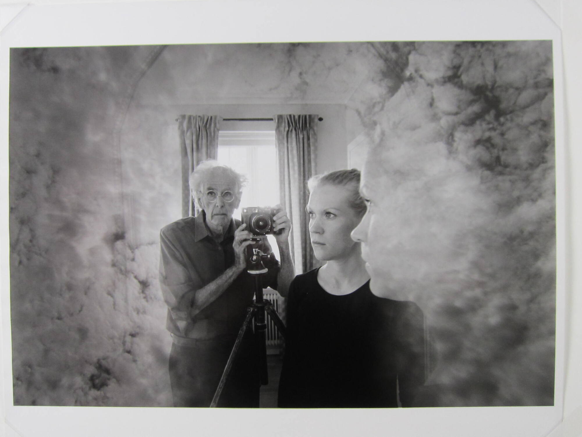DescriptionImage of man wearing glasses (Jerry Uelsmann) standing beside a camera that is mounted on a tripod. A woman stands in front and just off to the side of him, mostly in profile. Clouds surround both of them and a window with open curtains is centered in the background.ProvenanceJerry Uelsmann, Gainesville, FL;