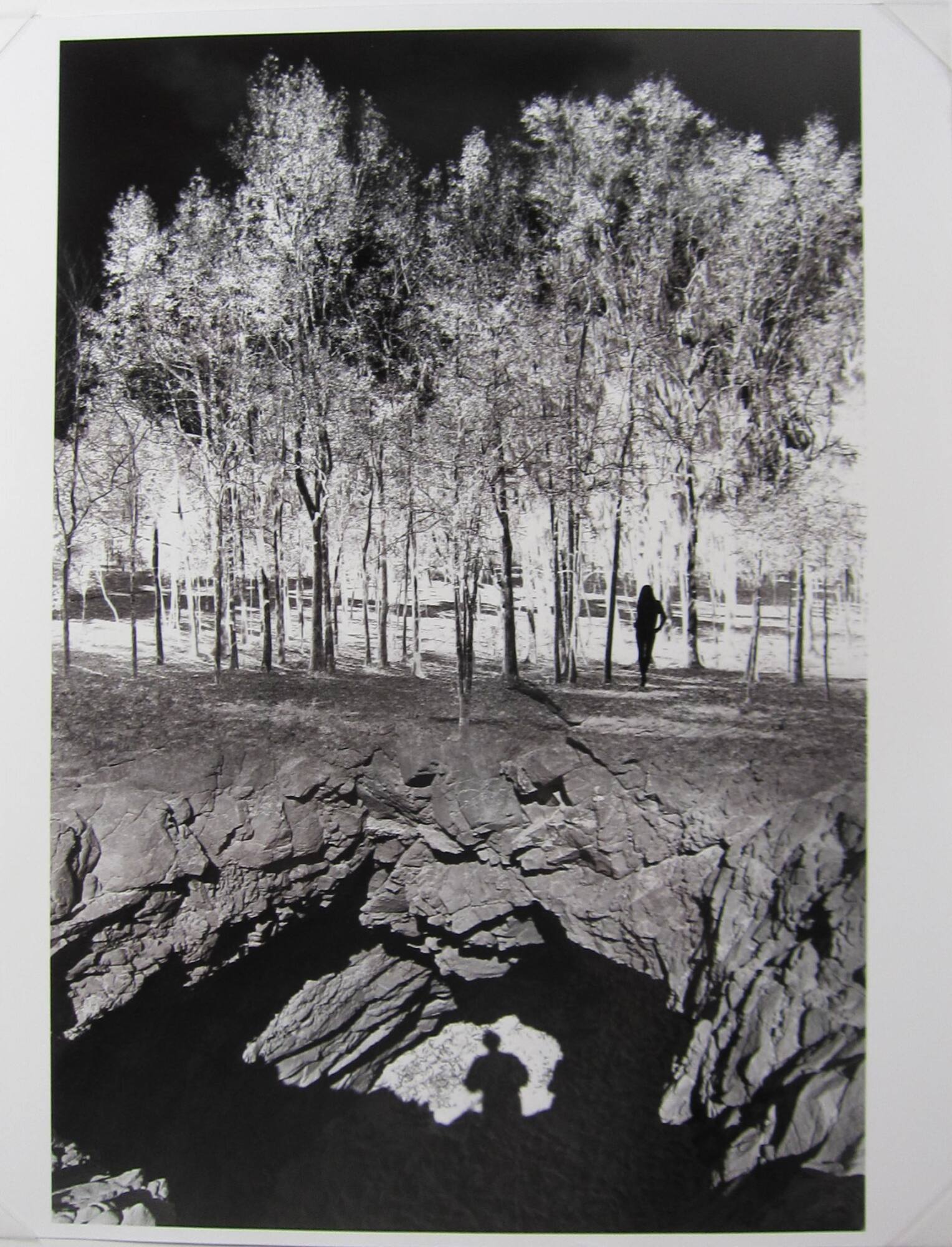 DescriptionImage of a forest (represented in negative) with a silhouetted figure near center right; the forest leads to a rocky cliff where the shadow of a figure is seen in the lighted area.ProvenanceJerry Uelsmann, Gainesville, FL;