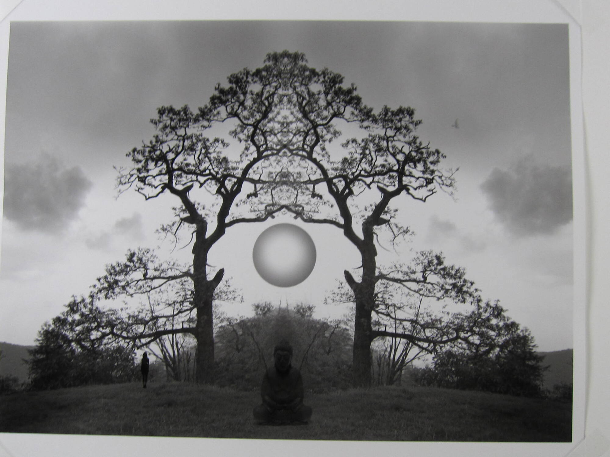 DescriptionImage of an almost symmetrical image of two trees connecting in the center with an orb and a Buddha figure below. To the left, a silhouetted figure stands in the grassy landscape and in the upper right, a bird flies through the clouds.ProvenanceJerry Uelsmann, Gainesville, FL;