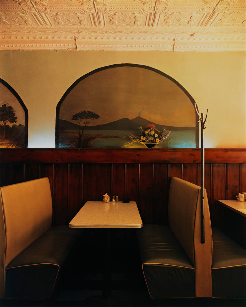 DescriptionImage of an empty booth in a restaurant with a mural painted above. The mural depicts an idealized landscape with a seaside village next to mountains.ProvenanceHall Family Foundation, Kansas CIty, MO, 2019;