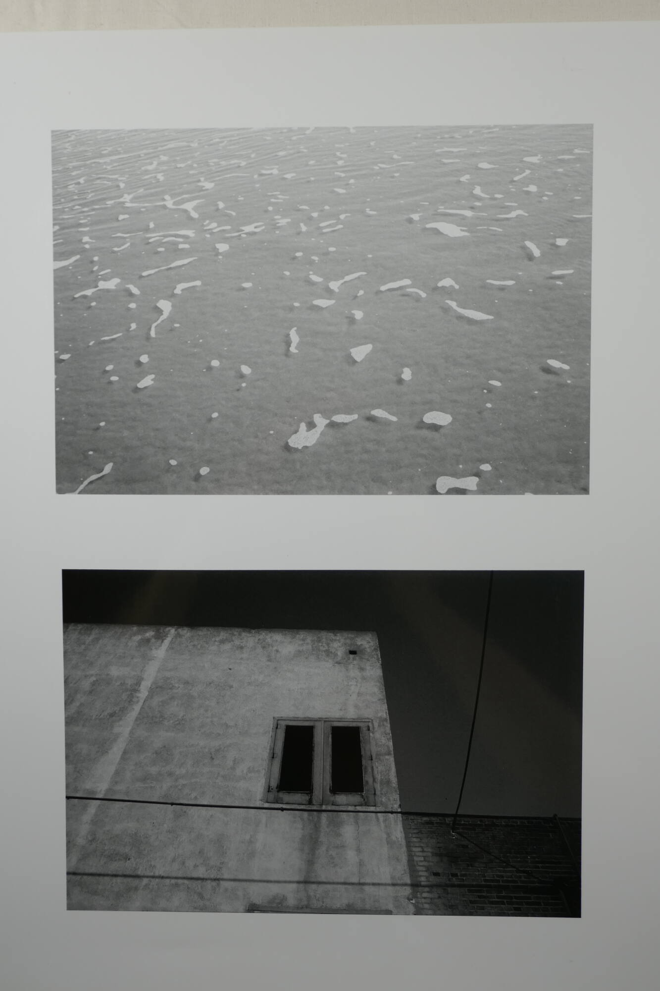 DescriptionTwo horizontal images printed on a vertical sheet. The top image of a body of water with foam floating throughout. The bottom image is of two facades; one concrete structure with a double window next to a shorter brick building.ProvenanceWilliam Lyons, Kansas City, MO;