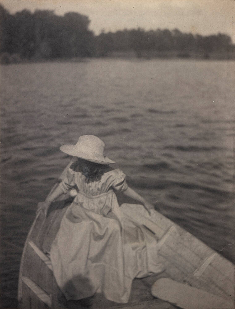 DescriptionImage of girl wearing a long dress and straw hat seated in a boat. A vast expanse of water is behind her and the shore is densely lined with trees.ProvenanceGeorge R. Rinhart, Palm Springs, CA;