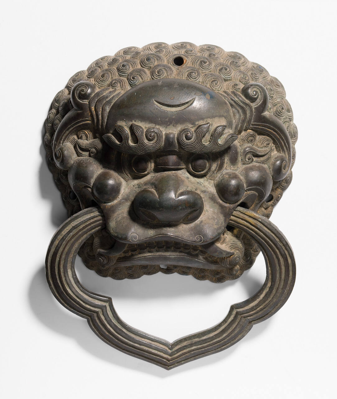 DescriptionLion with curly mane, eyebrows, bulbous snout, puffed cheeks, bared teeth, holding bronze pull in mouth; dark brown patina, traces of gilding.