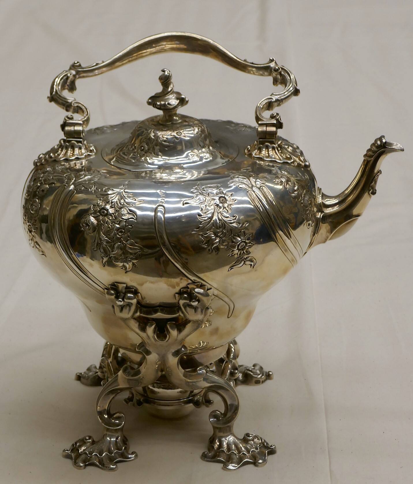 DescriptionInverted pear–shaped body with attached swing handle with spiral finial; chased floral decoration within scrolled lobes on body and stamped with armorial crest of crowned eagle on kettle and burner; accompanied by a three–legged, open work foliate stand and separate heater.Exhibition HistoryRecent Gifts of Architecture, Design and Decorative Arts, The Nelson-Atkins Museum of Art, Kansas City, Missouri, July 30 2022–January 21 2024, no cat.