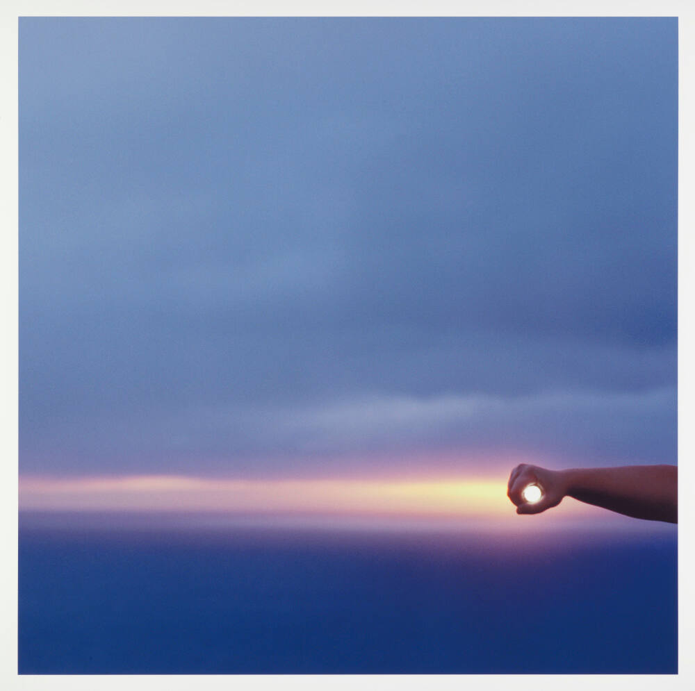 DescriptionImage of a sunset/sunrise with soft narrow layers of pink, orange, and yelllow dividing a blue sky. A hand reaches out from the right edge of the frame to encircle the sun with its fingers.Gallery LabelIn her series I Control the Sun, Lilly McElroy creates the illusion that she can contain the luminous celestial body located approximately 93,000,0000 miles from the earth in the palm of her hand. McElroy replicates this gesture in various geographic locations. Her intentions are both playful and serious. She pokes fun at our propensity for photographing dramatic sunsets, no matter how clichéd the subject, while also suggesting that our efforts to control forces far greater than ourselves is in vain.
