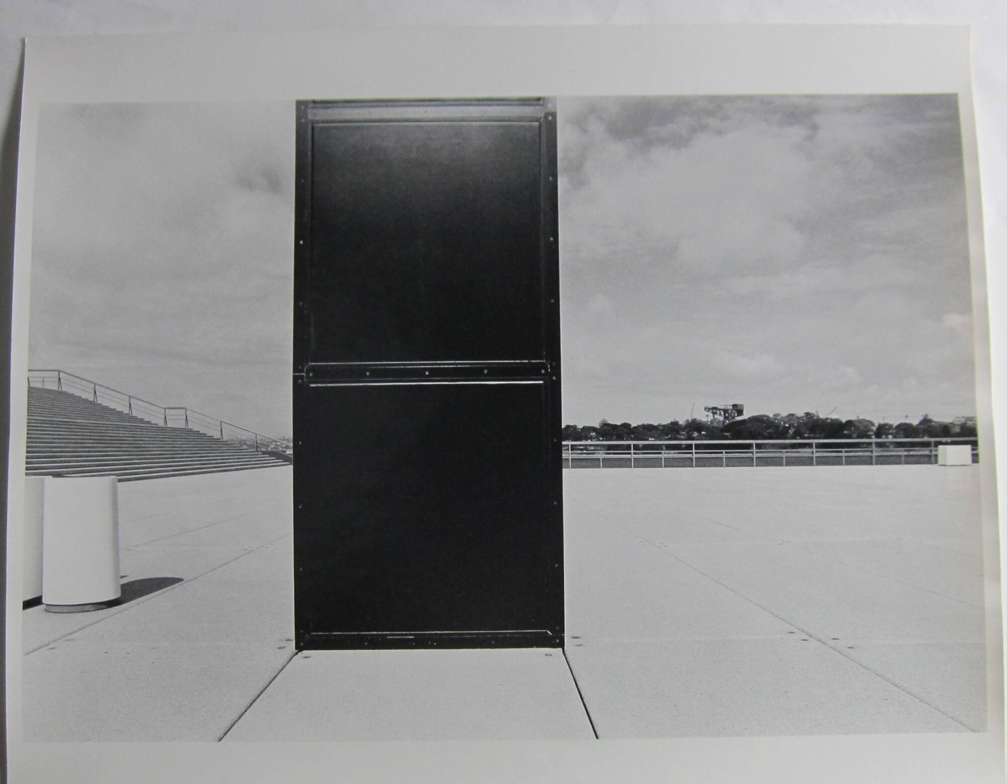 DescriptionImage of a large dark rectangular structure near the center of a tiled terrace with stairs on the left and a row of foliage on the right behind the railing. The sky is filled with clouds.Gallery LabelDoes this black "door" lead inside or outside? Is it attached to a building or does it stand somehow on its own?